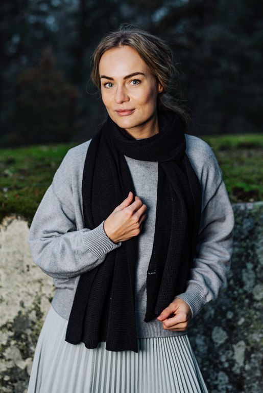 Käsityönä merinovillasta neulottu lämmin ribbineuloshuivi, joka on tilattavissa eri väreissä; meleerattu musta, meleerattu petrooli, meleerattu sininen ja meleerattu oranssi.